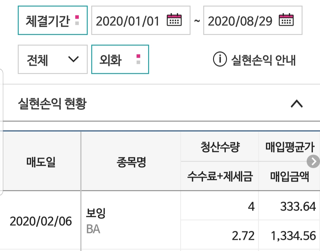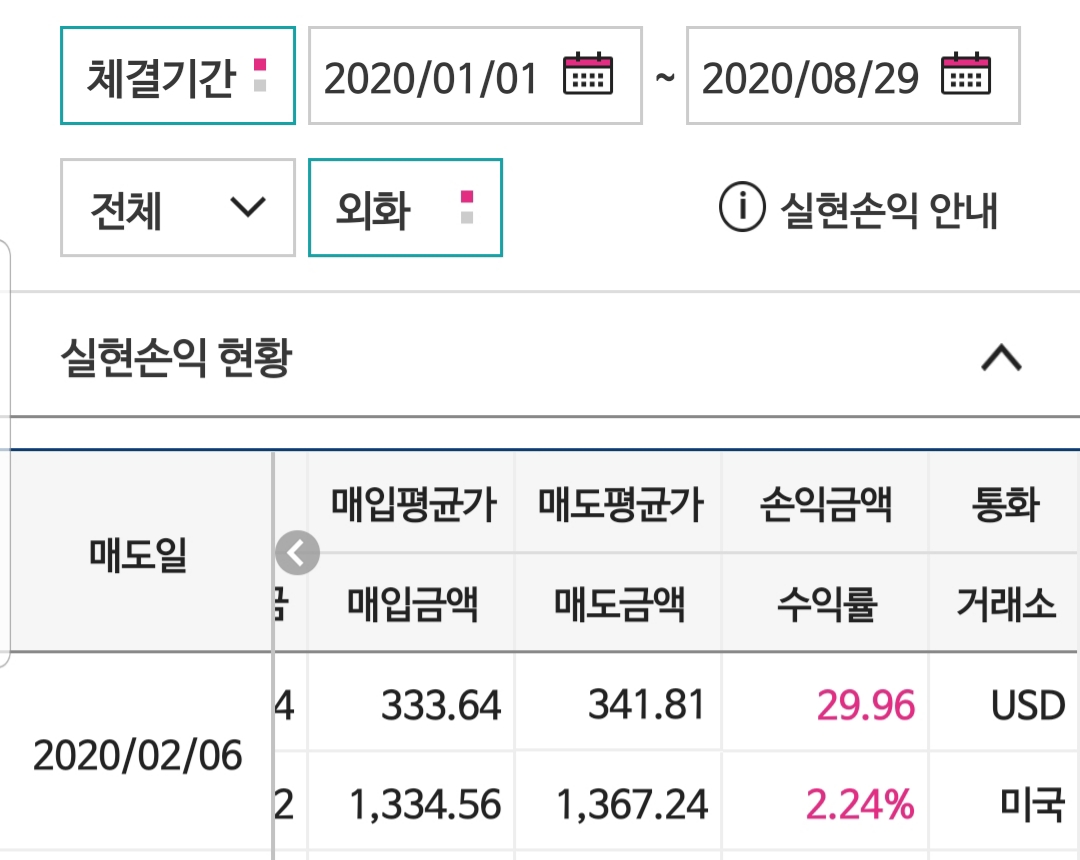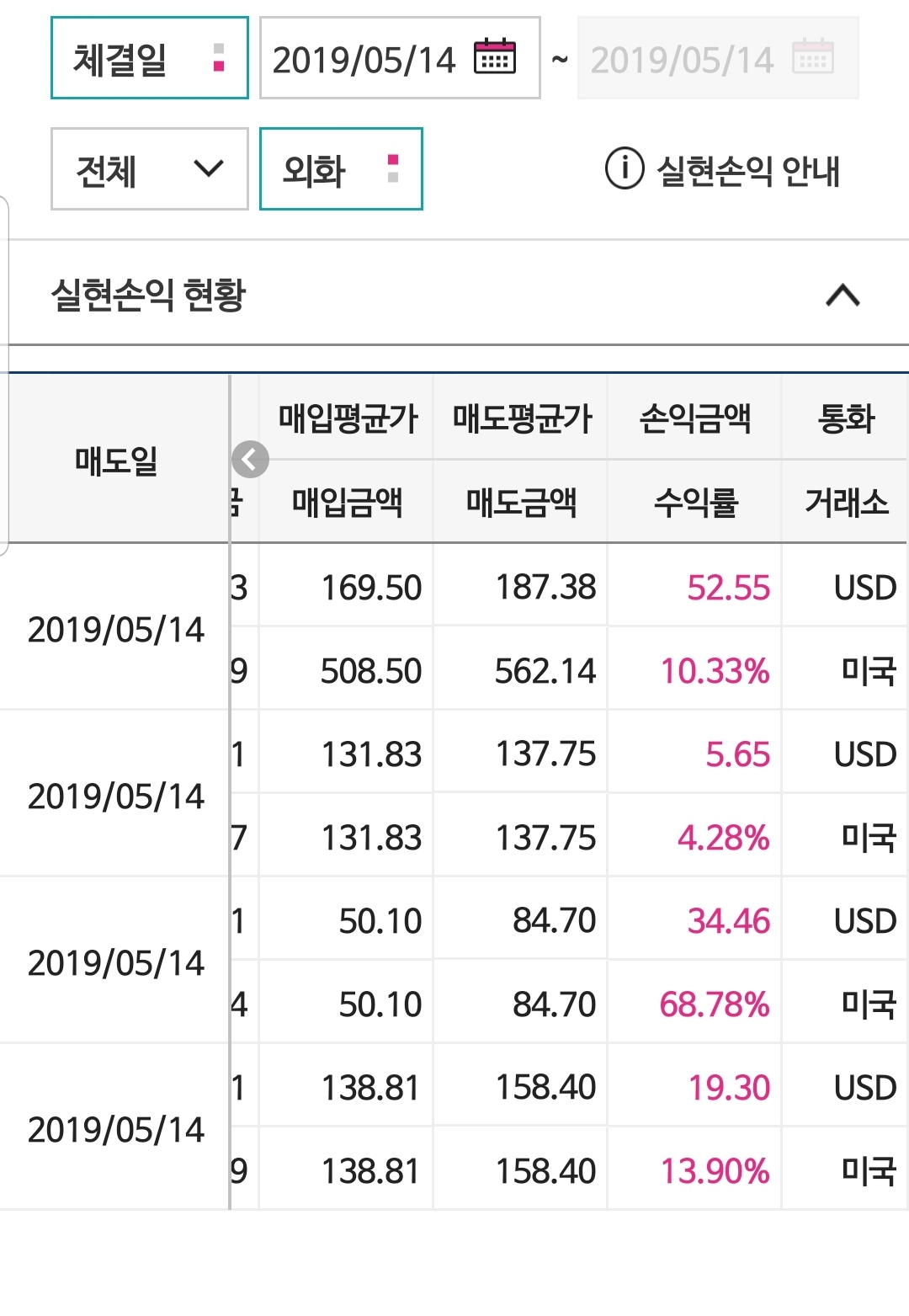 미국주식을 시작한지 몇 개월 되지 않을 때인 2019년도 실현손익을 찾아보았습니다. 5월 14일 경에 애플, 존슨앤드존슨, 퀄컴, 비자를 매도하여 수익을 본 기록이 있네요.