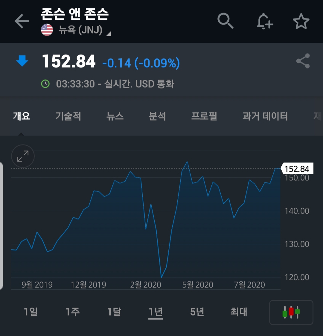 존슨앤존슨도 152불로 그 당시에 팔지 않았더라면 수익을 보고 있겠지요. 다만 코로나 여파로 급락했던 주가가 어마어마합니다. 사실 가지고 있으면서 마음 편한 주식이 아니었기에 이는 후회는 없어요.
