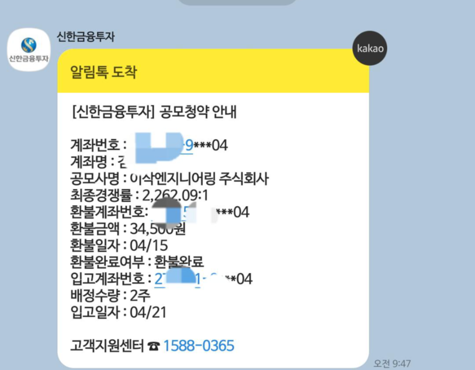 배정수량이 0개인 줄 알았는데 다음날 알림톡을 확인해보니 2주가 배정되었더군요! 배정을 이틀 뒤인 15일에 진행했나 봅니다. 신한금투가 계좌이체 등의 전산상 오류가 잦아 많은 분들이 참여하지 못했나 봅니다. 최소배정임에도 불구하고 2주가 배정되었으니 말입니다.